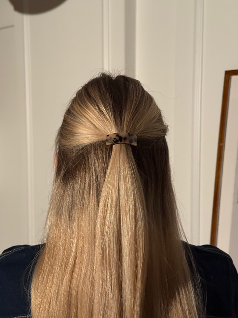 Matu gumija tumši brūnā tonī ar dekoratīvu gaiši plankumainu elementu (5 cm garšs, 1 cm plats). Tā lieliski notur matus ikdienā un piešķir frizūrai stila akcentu. Piemērota gan ikdienai, gan īpašiem brīžiem, kad vēlies savam izskatam pievienot nelielu odziņu.
